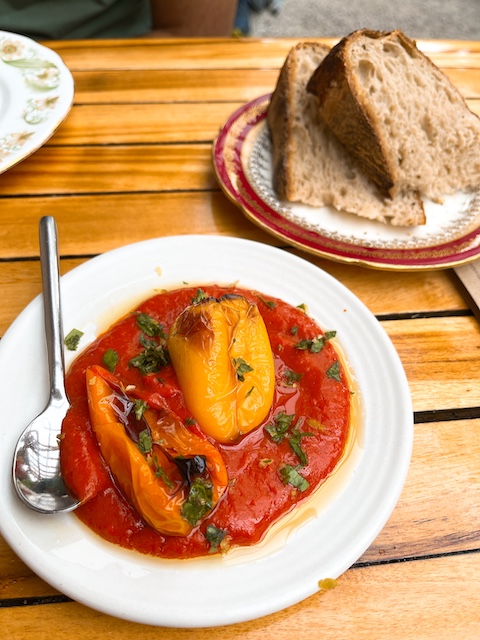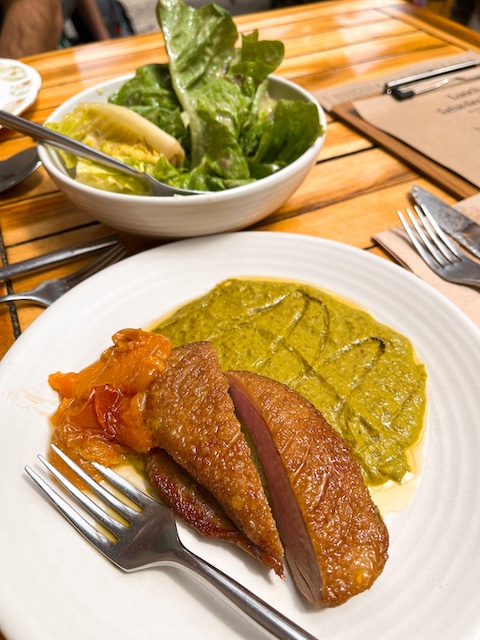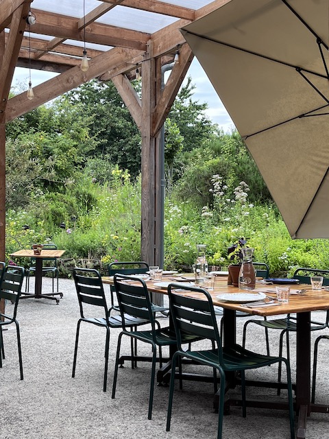 So, for this celebratory day out, we went to Riverford Field Kitchen for an organic lunch. I booked in a few weeks ahead and could only get a table outside, surrounded by greens and flowers — fantastic!