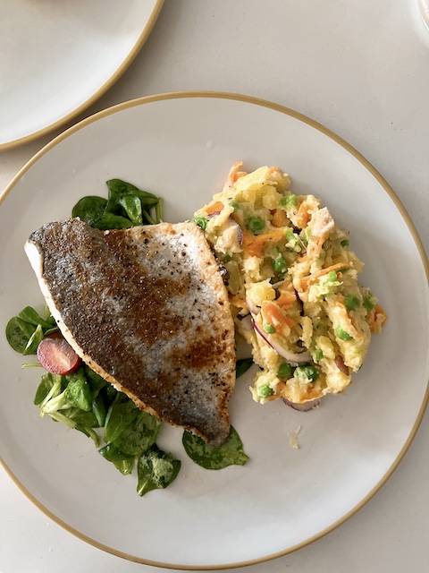 I enjoyed the appetising potato salad with pan-fried sea bream and some dressed greens. A healthy, colourful, and delicious whole-food lunch.