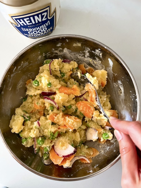 - When the potatoes are done, drained and mash it with a fork or use a masher. Stir in the carrots , macerated onions (but not the lemon juice), and mayonnaise. Then mix again.