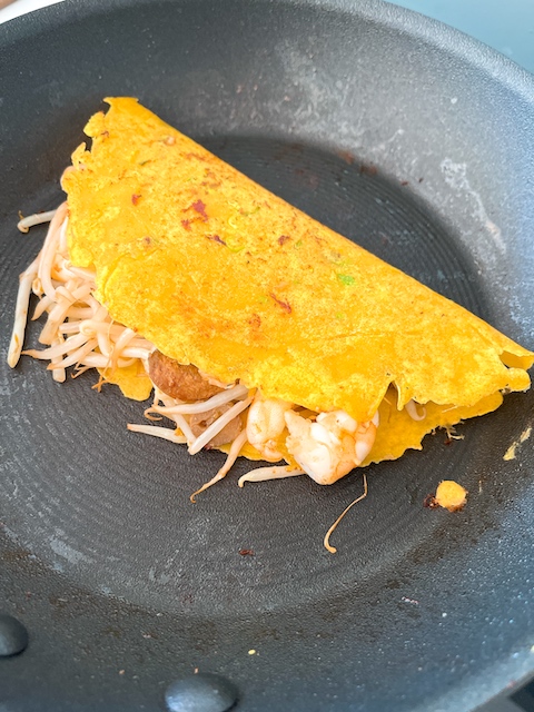 Is it difficult to make? To a restaurant, I guess not; at home, several components make this Vietnamese crêpe (or pancake) less friendly. Let me explain what I mean.